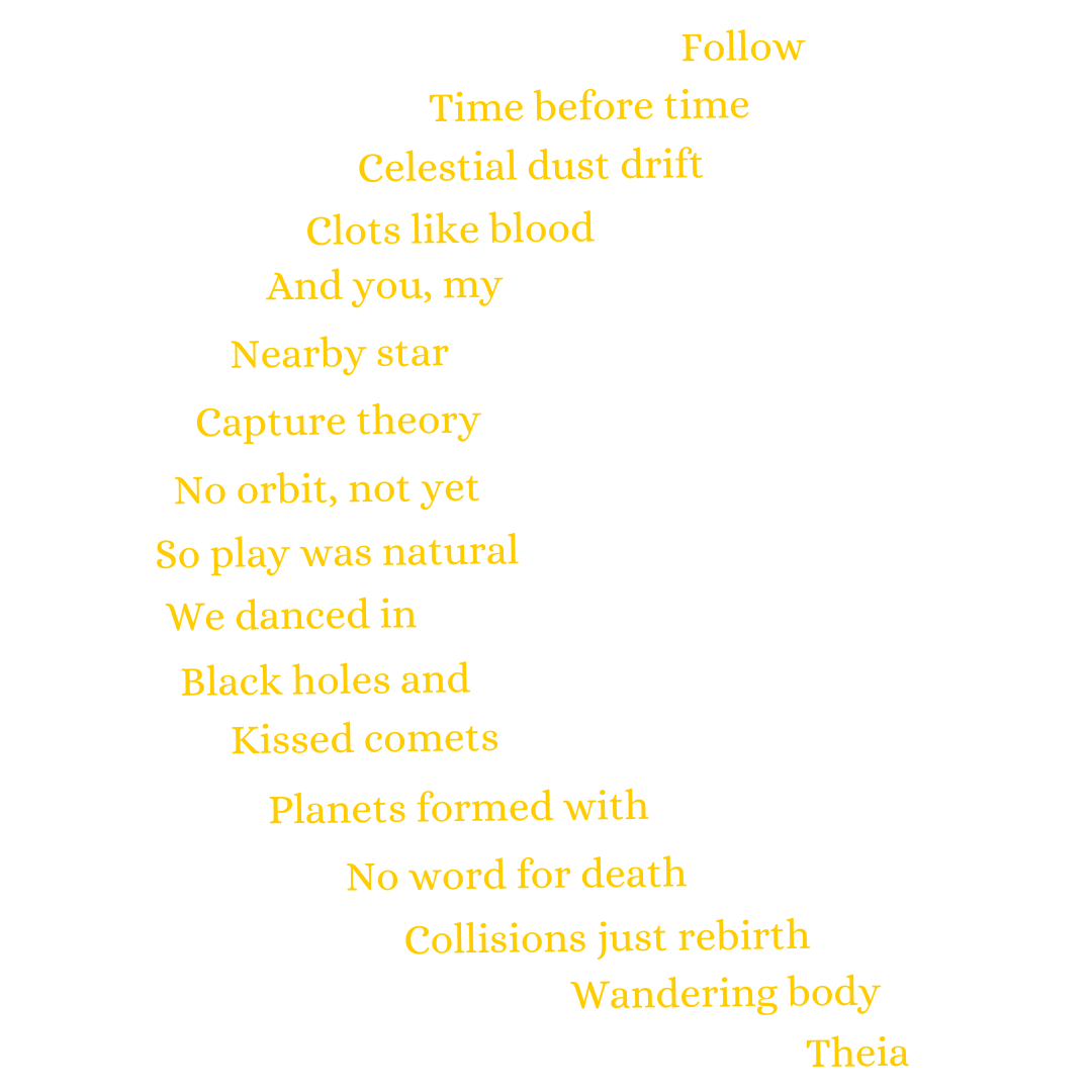 The resulting poems tell the story of Theia, aka the moon before it was the moon, and the very first star, methuselah, who fell in love and were separated by space stuff. Billions of years later, the moon, now stuck circling the Earth, looks for the reincarnation of her lost lover in animals and people on the street. Because, after all, we are all made of star dust!!